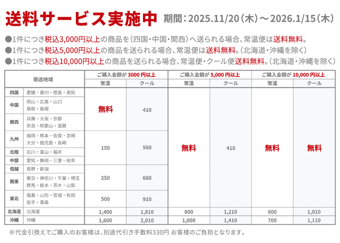 ■1件につき税込3,000円以上のご購入でお届け先が「北海道・東北・北陸・中部・信越・関東・沖縄」へは常温便、クール便ともに通常より送料が600円お得になります。